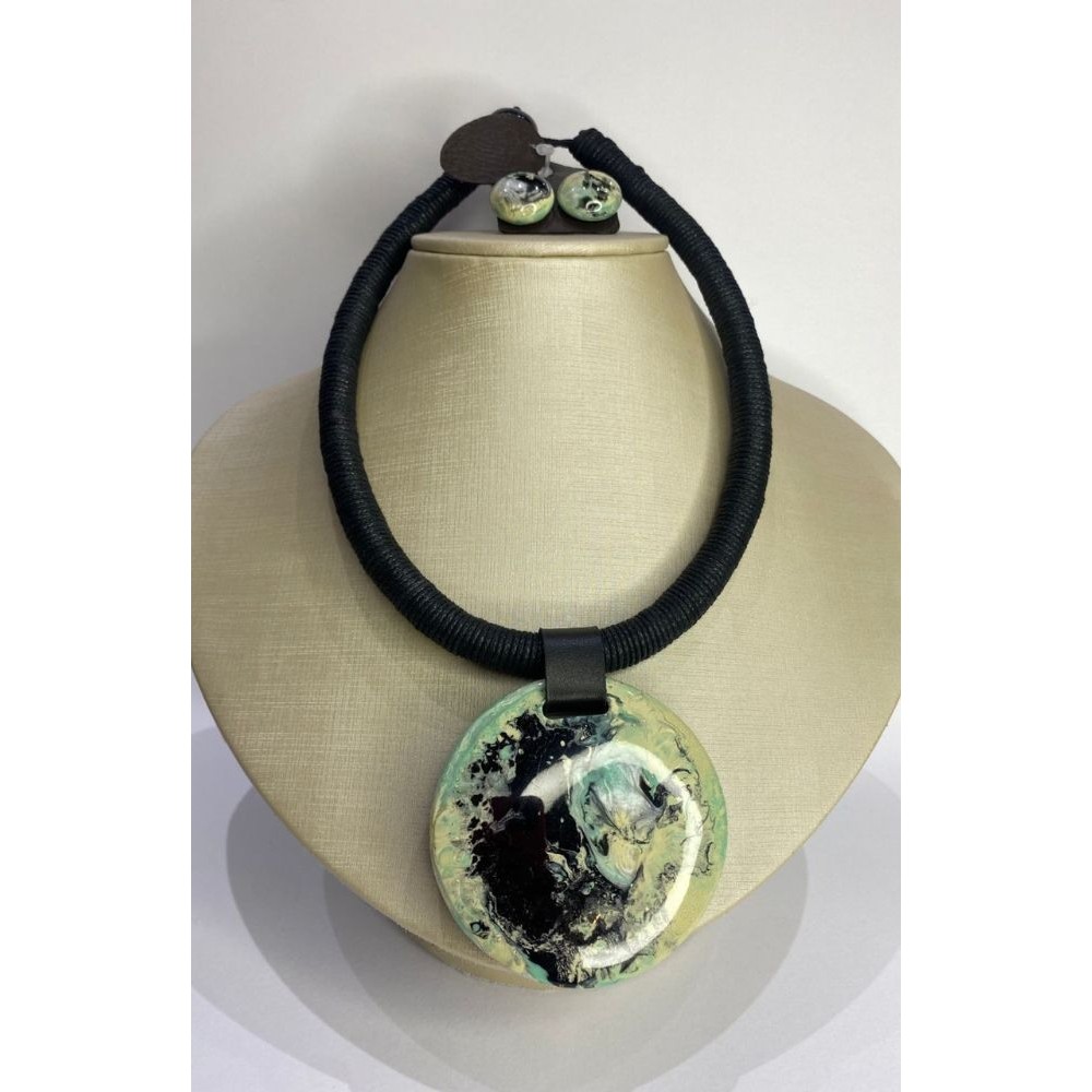 O cordão revestido em preto fosco dá base à composição e destaca o pingente como o verdadeiro protagonista. Acompanha um par de brincos redondos, também em resina, com o mesmo efeito artístico. Ideal para quem ama um toque de mistério com sofisticação contemporânea.